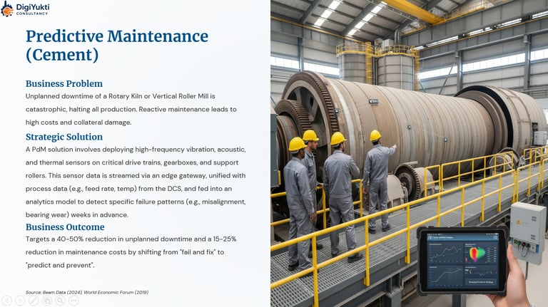 Move beyond reactive and preventive maintenance. Deploying advanced IoT sensors and AI/ML models on high-impact assets specific to your industry: SAG Mills & Crushers (Mining), Rotary Kilns & Vertical Roller Mills (Cement), and Blast/Electric Arc Furnaces (Metal)
